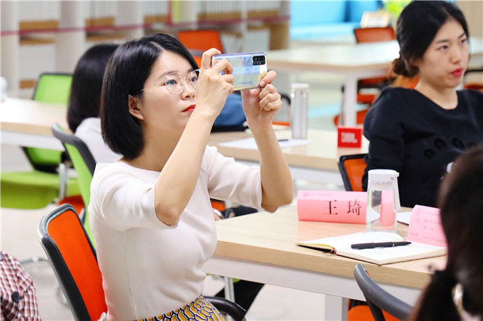 李晓燕老师分享了自己利用蓝墨云班课作为信息化的教学平台,采用线上线下混合式教学的模式,以课堂活动设计的案例。课前,充分备课。她会在各类网络平台上搜罗大量与课程相关的图片、新闻、视频等资源,把提前放在云班课中让学生提前预习,后台会自动记录学生学习情况,结合奖惩的方式,大大提高学生学习的积极性和自主性。课中,环环相扣。她认为资源重在“最新”,互动重在“有效”。在引入案例时要注重时事,要贴近学生生活。在互动环节设计上,她通常采取分组协作、抢答、思维导图、场景拍照、图片拼贴、抽奖、幸运大转盘等多种形式,结合奖惩,让课堂活起来。课后,讲求创新。布置作业时,她讲究创新,以避免学生一味地抄袭,如录制有声情书,制作视频,动手小制作等,学期结束后她会将每一位学生的作业建档,做好课堂实践记录。