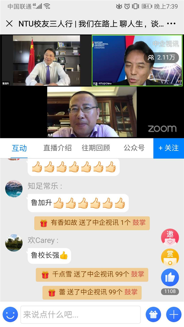 今天19:30,我校董事长、校长鲁加升教授做客《中国企业报》旗下的官方直播平台 - “中企视讯”推出的《NTU校友三人行》直播节目,结合自己经历,融入当今社会上的热门话题,与新加坡南洋理工大学中国办公室主任文泉,上海荣南科技有限公司创始人、董事长金涛一起聊人生、谈业务、涨知识、找机会。