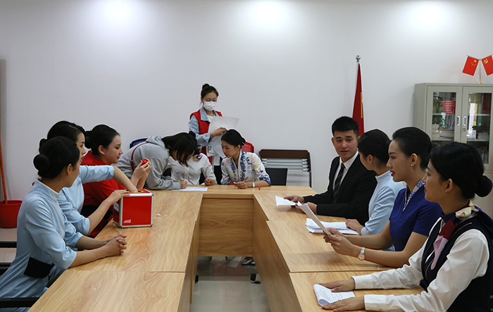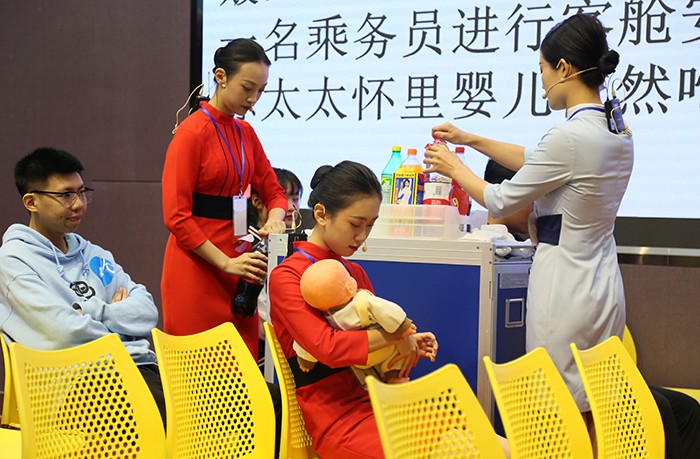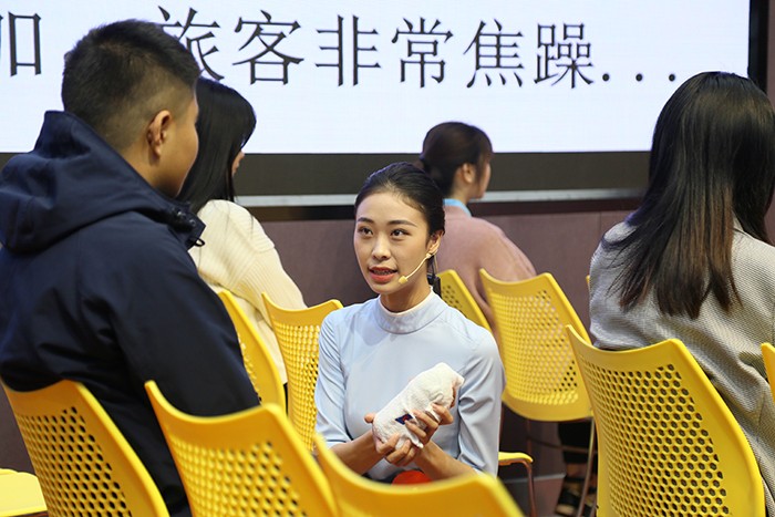 在形象展示环节,参赛选手演绎了站姿、走姿、鞠躬礼、手势礼等基本礼仪。整齐的服装、挺拔的身姿、甜美的微笑、标准的动作和良好的素养成为赛场上一道靓丽优雅的风景线。在情境模拟环节,28名选手提前抽签进行分组,组成7 支代表队。考题以飞机上乘务服务为主,地勤服务为辅,涉及民航特殊旅客服务、应急处理、舱内日常服务、投诉处理等技能考核,主要考察选手服务技能与沟通能力、应变能力、团队协作能力。参赛选手们斗智斗勇,将航空礼仪知识融入到比赛中,从不同角度、不同层次诠释了文明礼仪的深刻内涵,也充分展示出空乘专业同学的素质与风采以及应对困难时的镇定自若。