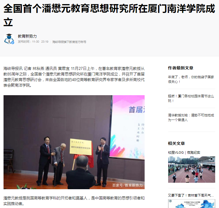 海峡导报:全国首个潘懋元教育思想研究所在厦门南洋学院成立