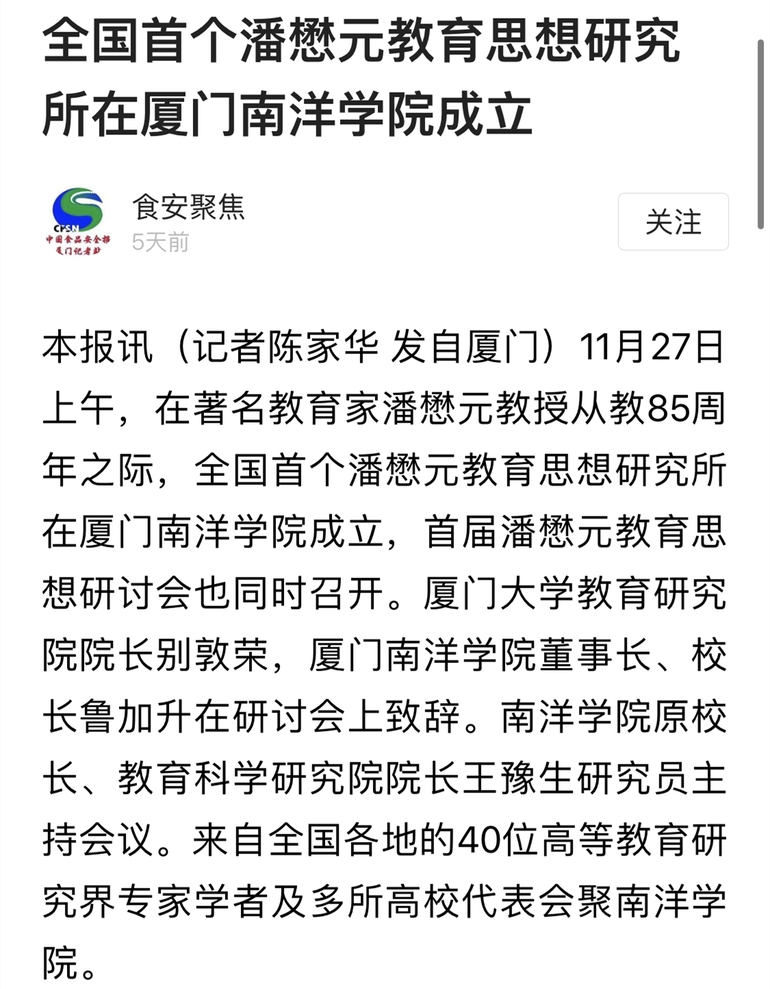 食安聚焦:全国首个潘懋元教育思想研究所在厦门南洋学院成立