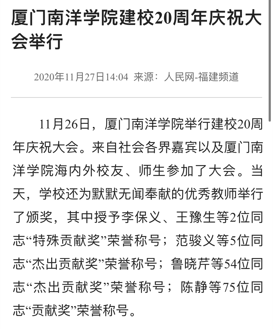 人民网:厦门南洋学院建校20周年庆祝大会举行