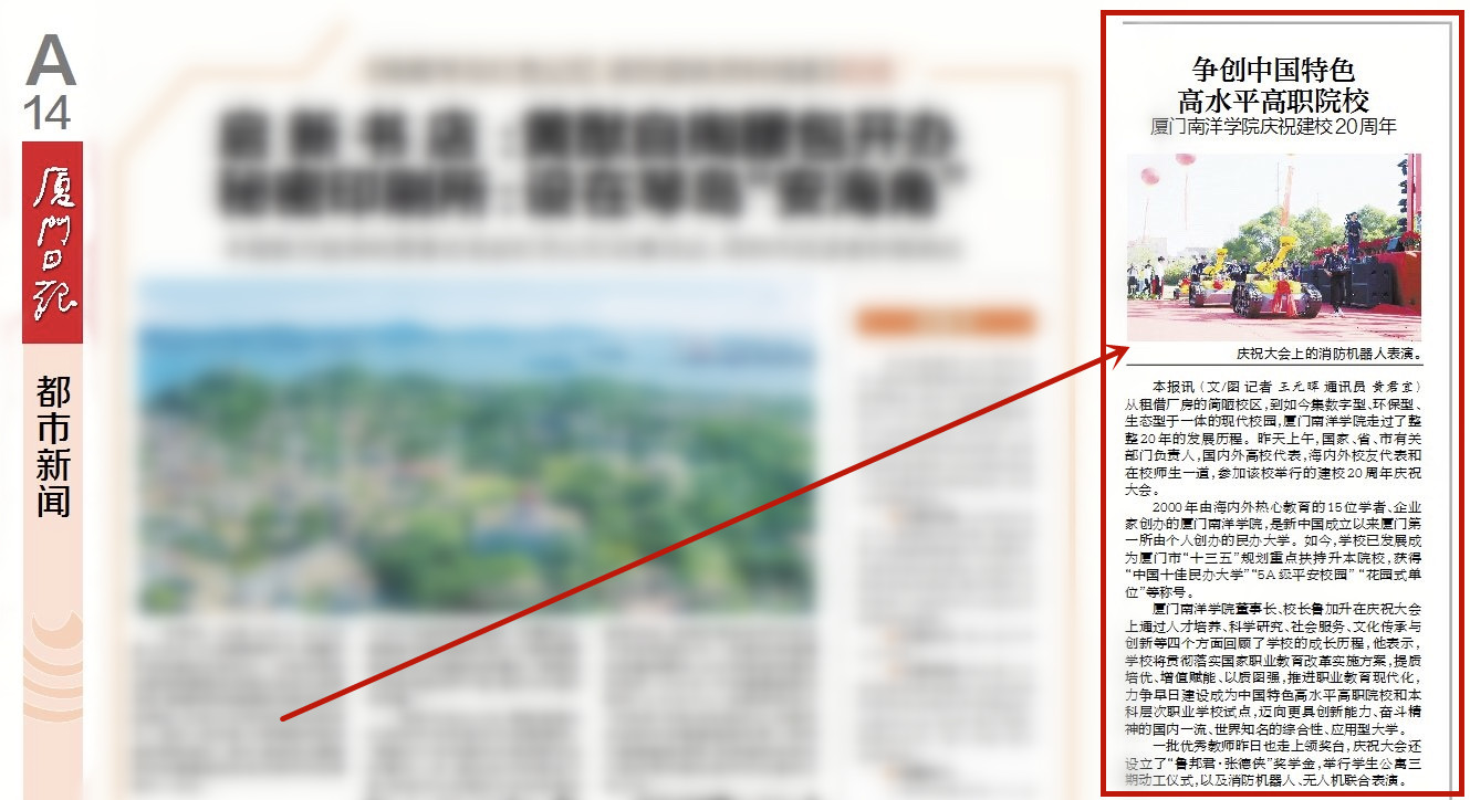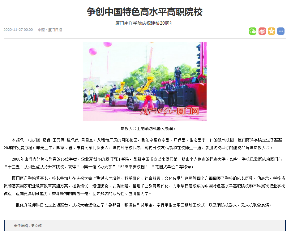 厦门日报:争创中国特色高水平高职院校 厦门南洋学院庆祝建校20周年