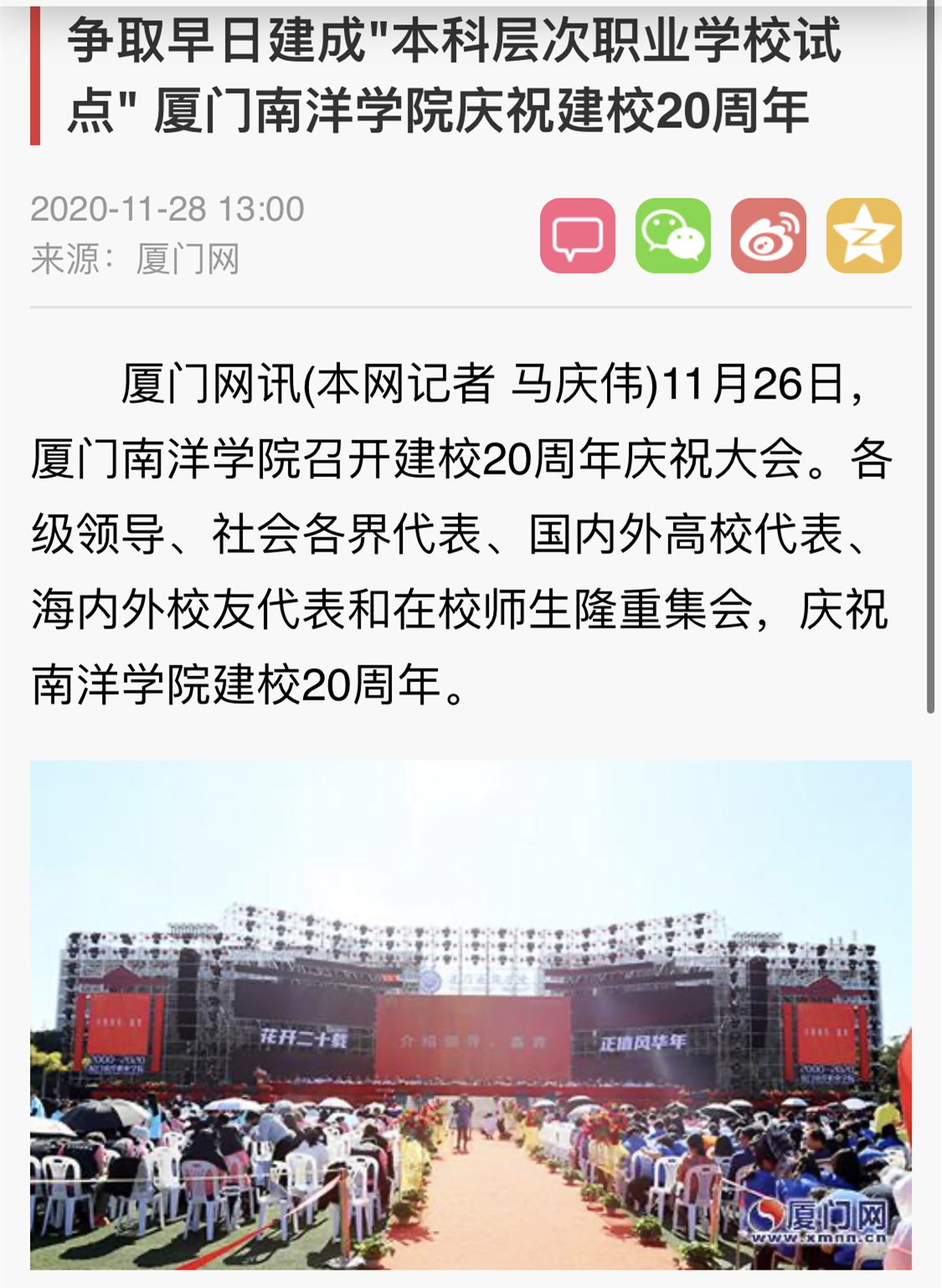 厦门网:争取早日建成"本科层次职业学校试点" 厦门南洋学院庆祝建校20周年