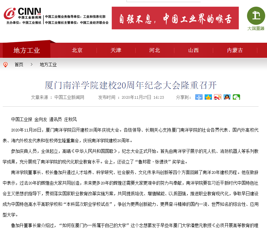 中国工业报:厦门南洋学院建校20周年纪念大会隆重召开
