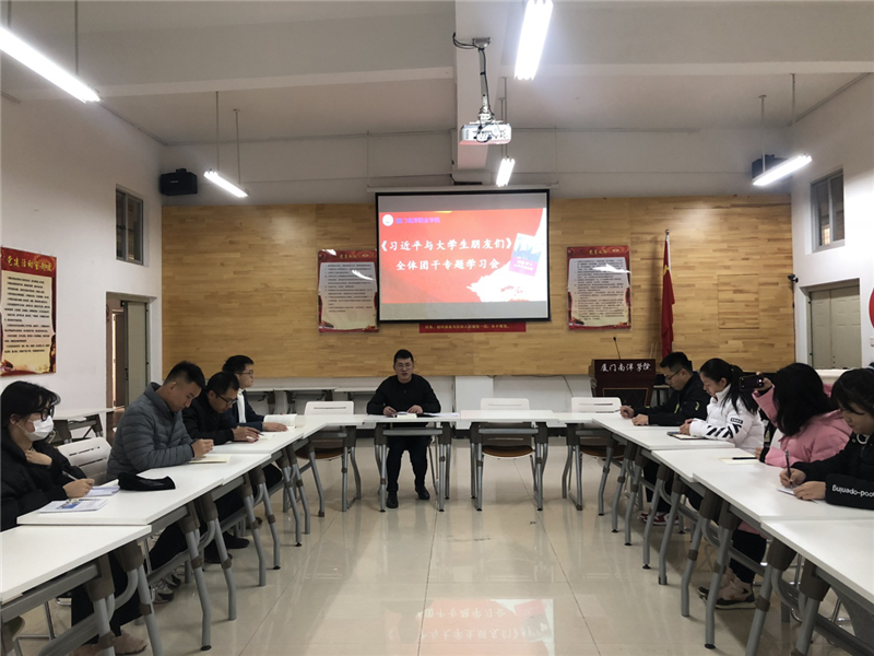 2021年1月12日,我校团委在活动中心307,召开全体团干学习《习近平与大学生朋友们》专题会暨学习《习近平与大学生朋友们》启动仪式。校团委李蕊书记对全体团干提出“精心组织、全员学习、全校覆盖”要求,校团委办公室杨大进主任向会议报告书籍发放情况及作“如何切实有效地开展专题学习”交流,使青年团员学习常态化,不流于形式,会上全体团干共同参与学习讨论。