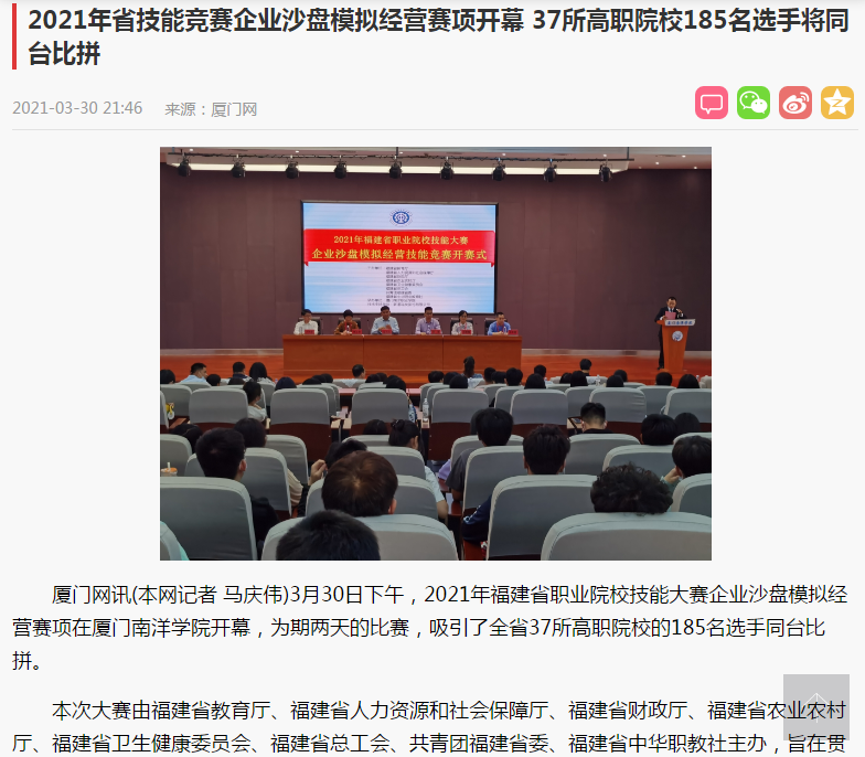 厦门网讯(本网记者 马庆伟)3月30日下午,2021年福建省职业院校技能大赛企业沙盘模拟经营赛项在厦门南洋学院开幕,为期两天的比赛,吸引了全省37所高职院校的185名选手同台比拼。
