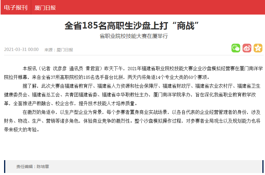 本报讯(记者 沈彦彦 通讯员 黄君宜)昨天下午,2021年福建省职业院校技能大赛企业沙盘模拟经营赛在厦门南洋学院拉开帷幕,来自全省37所高职院校的185名选手登台比拼,两天内将角逐14个专业大类的60个赛项。