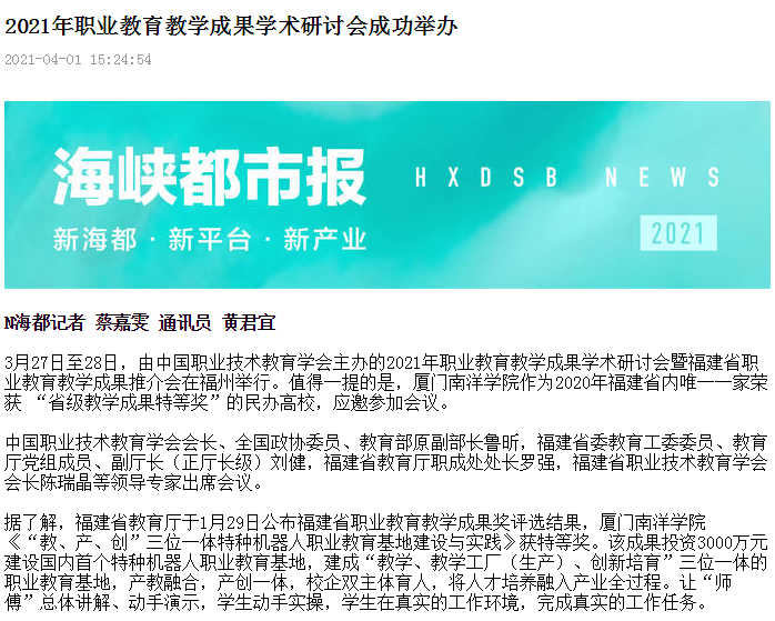 3月27日至28日,由中国职业技术教育学会主办的2021年职业教育教学成果学术研讨会暨福建省职业教育教学成果推介会在福州举行。值得一提的是,厦门南洋学院作为2020年福建省内唯一一家荣获 “省级教学成果特等奖”的民办高校,应邀参加会议。