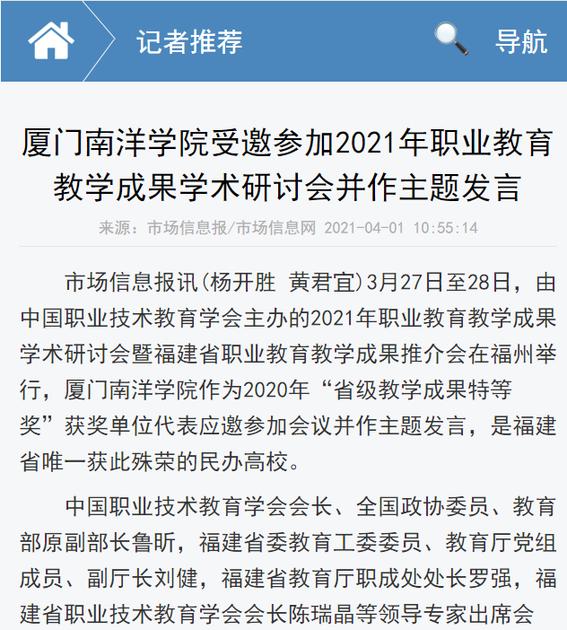 市场信息报讯(杨开胜 黄君宜)3月27日至28日,由中国职业技术教育学会主办的2021年职业教育教学成果学术研讨会暨福建省职业教育教学成果推介会在福州举行,厦门南洋学院作为2020年“省级教学成果特等奖”获奖单位代表应邀参加会议并作主题发言,是福建省唯一获此殊荣的民办高校。