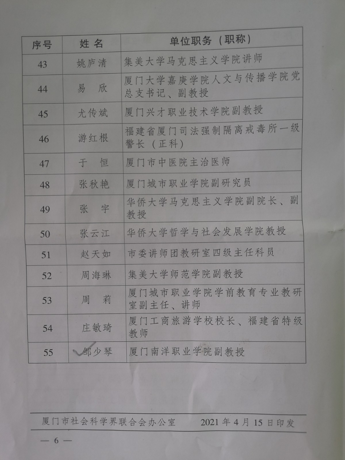 近日,厦门市社会科学界联合会公布“2021年‘鹭江讲坛’增聘报告人名单”,经我校推荐申报的14名候选人全部入选,他们是施水成、康乃美、鲁晓芹、李振杰、蓝德森、崔筱力、侯红科、黄芸、李建清、刘艳艳、毛琛、邹少琴、李娜、许欣欣。