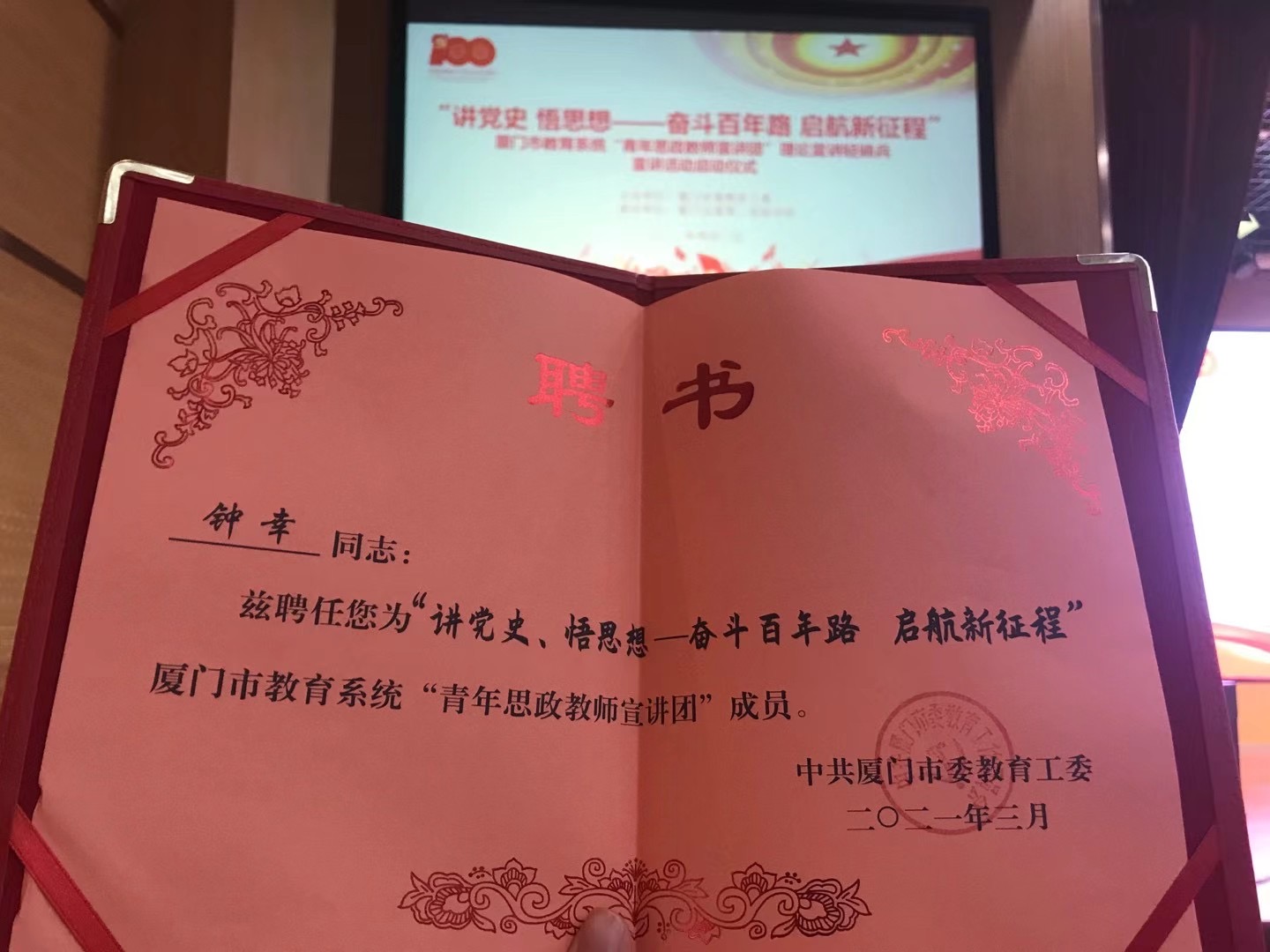 近日,由厦门市委教育工委组织牵头的教育系统“青年思政教师宣讲团”理论宣讲轻骑兵宣讲活动在厦门五缘第二实验学校举办,我校人文社科学院思政部教师钟幸获聘首批“青年思政教师宣讲团”成员,担负巡回宣讲工作。