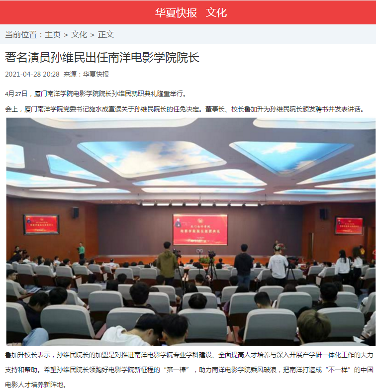 华夏快报:著名演员孙维民出任南洋电影学院院长
