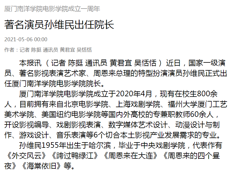福建日报:厦门南洋学院电影学院成立一周年 著名演员孙维民出任院长