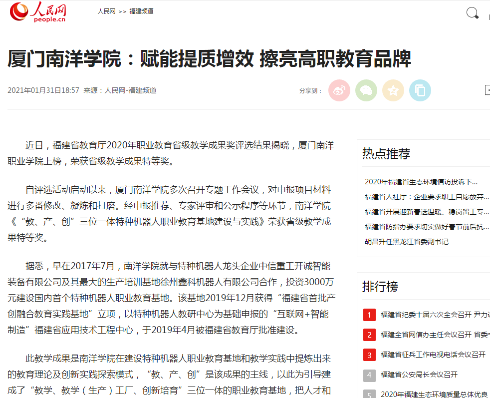 自评选活动启动以来,厦门南洋学院多次召开专题工作会议,对申报项目材料进行多番修改、凝炼和打磨。经申报推荐、专家评审和公示程序等环节,南洋学院《“教、产、创”三位一体特种机器人职业教育基地建设与实践》荣获省级教学成果特等奖。