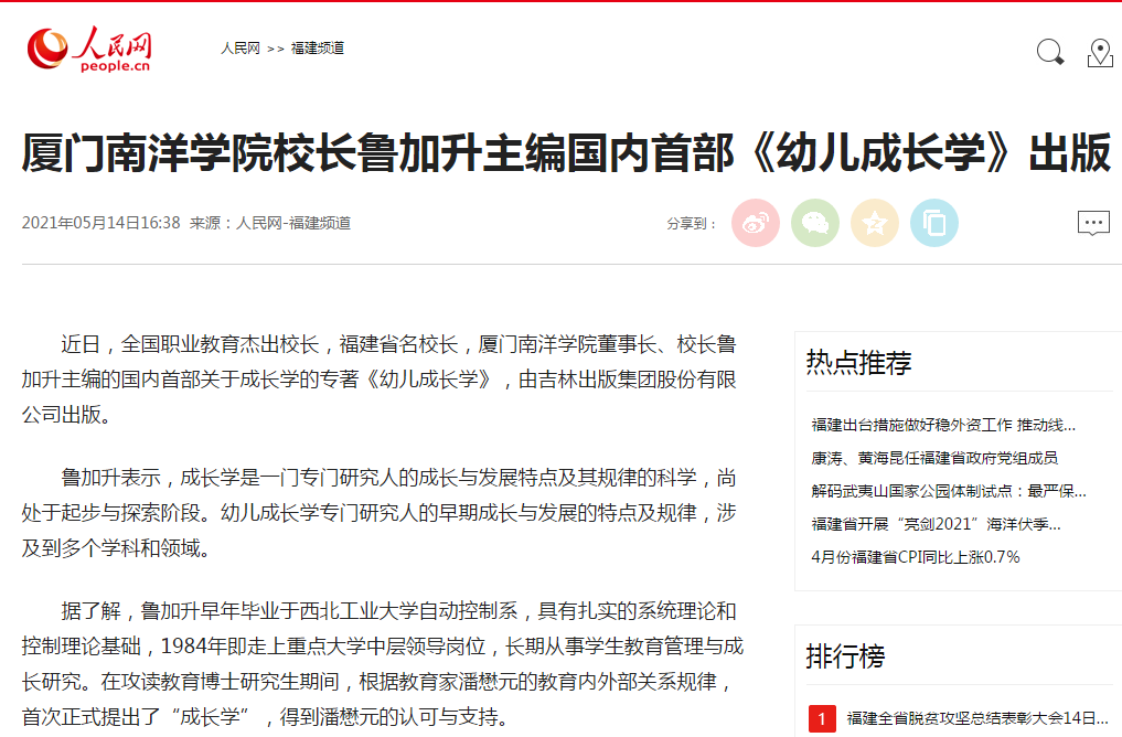 近日,全国职业教育杰出校长,福建省名校长,厦门南洋学院董事长、校长鲁加升主编的国内首部关于成长学的专著《幼儿成长学》,由吉林出版集团股份有限公司出版。