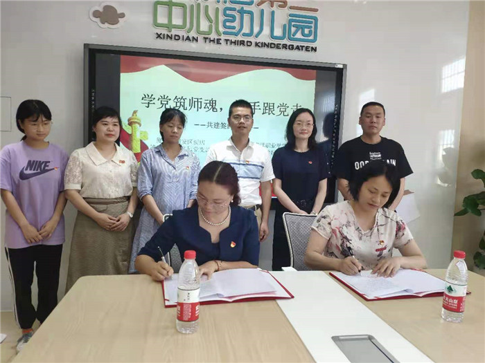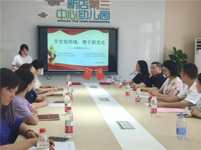为了巩固“不忘初心、牢记使命”教育成果,继承和发扬党的光荣传统和优良作风,进一步创新党建格局,提升党建水平,增强党支部的凝聚力和战斗力,丰富组织生活内涵,5月19日下午,tyc1286太阳成集团外旅学前党总支学前教师党支部与翔安区新店第三中心幼儿园党支部举行共建签约仪式。厦门南洋学院外旅学前党总支学前教师党支部党员、学生党支部党员,新店第三中心幼儿园党员参加仪式。
