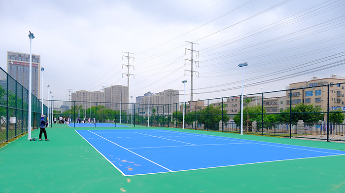 踩着新铺的蓝绿色交替的塑胶地板,穿过墨绿色的网状围栏,崭新的球场,给人一种充满活力的青春气息。