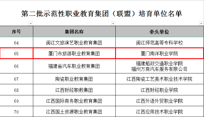 近日,教育部公布了第二批全国示范性职教集团(联盟)培育名单,由我校牵头组建的“厦门市旅游职教集团”代表福建省成功入选。