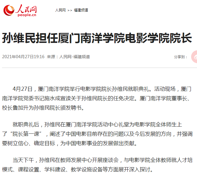 4月27日,厦门南洋学院举行电影学院院长孙维民就职典礼。活动现场,厦门南洋学院党委书记施水成宣读关于孙维民院长的任免决定。厦门南洋学院董事长、校长鲁加升为孙维民院长颁发聘书。
