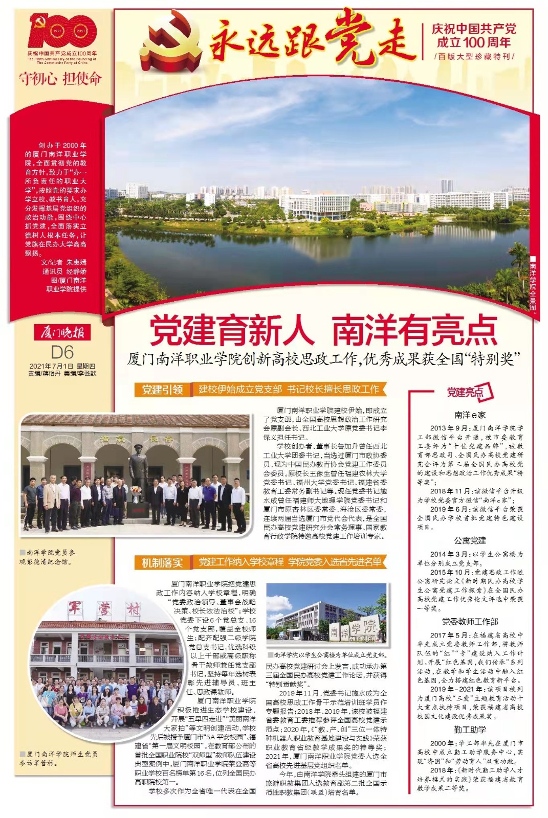 2018年,厦门南洋学院成为全省高校首批党建工作示范点培育建设单位;2019年,外国语旅游学前党总支入选“福建省党建工作标杆院系”培育创建单位,外国语旅游教师党支部入选“福建省党建工作样板支部”培育创建单位。2020年,荣登教育部遴选的“全国双师型师资队伍建设典型案例”百强榜,位列全国民办高职院校第一,也在福建省高职院校中居首;《“教、产、创”三位一体特种机器人职业教育基地建设与实践》在2020年职业教育省级教学成果奖中荣获特等奖。2021年,成功入选全省高校先进基层党组织名单。学校认真落实党建“双创”工作重点任务指南,今年4月已经完成全省示范点、标板院系、样板支部考核准备工作。