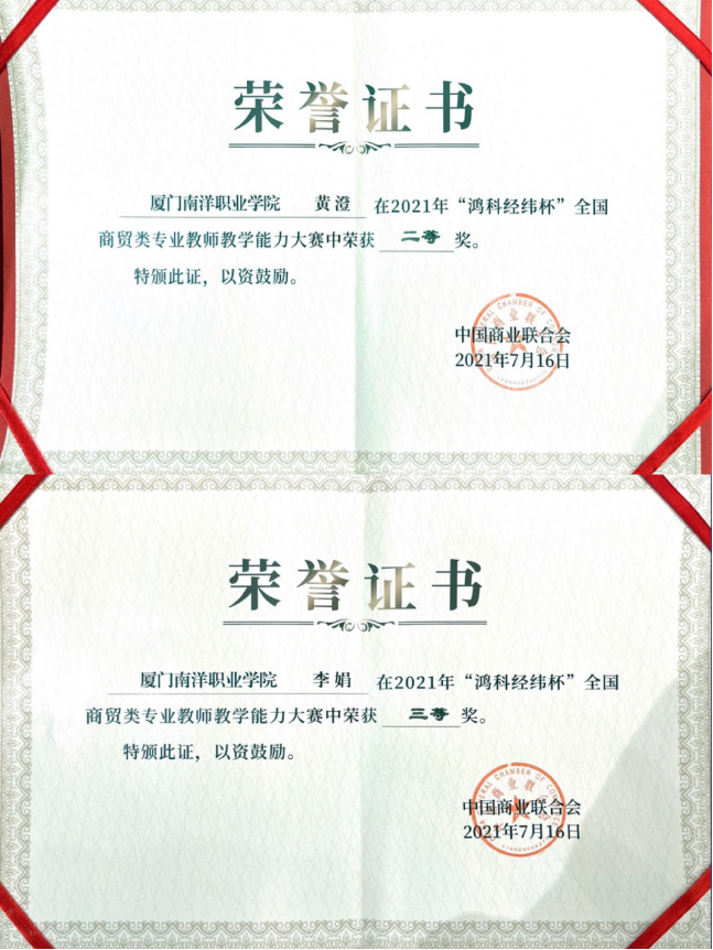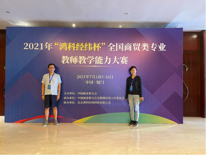 7月14-16日,由中国商业联合会主办、中国商业联合会互联网应用工作委员会承办、北京鸿科经纬科技有限公司协办的2021年“鸿科经纬杯”全国商贸类专业教师教学能力大赛在厦门成功举办。我校黄澄、李娟两位老师分别斩获二、三等奖。