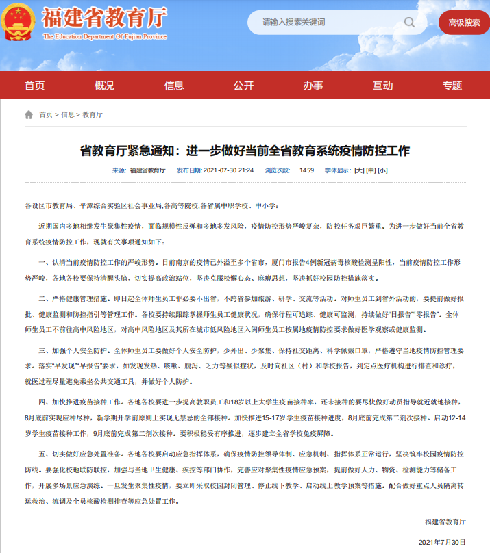 近日,福建省教育厅印发紧急通知部署进一步做好当前教育系统疫情防控工作。