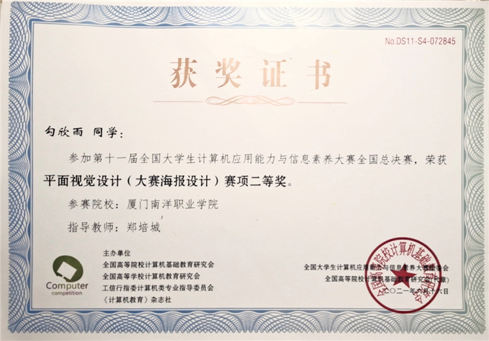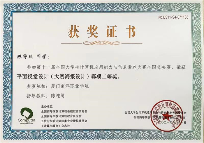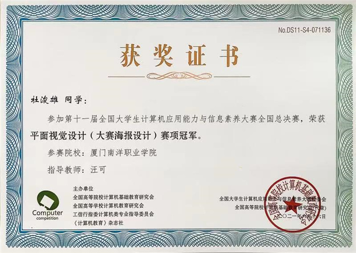 本届大赛还新增了平面视觉设计赛项,该赛项按照ACAA数字艺术设计职业技能规范,要求选手通过计算机技术完成创意设计。我校积极响应平面视觉设计赛项,参赛选手通过全新的技术手段展示绚丽多彩的艺术创作风格,实现艺术创新和设计实践的挑战,在大赛中获得了优异的成绩并展现了我校人才培养的成效与风采。