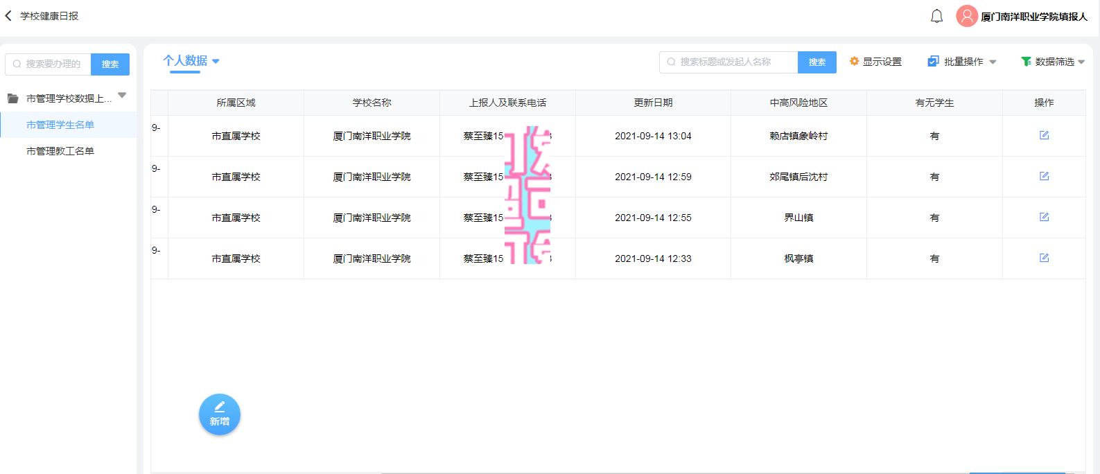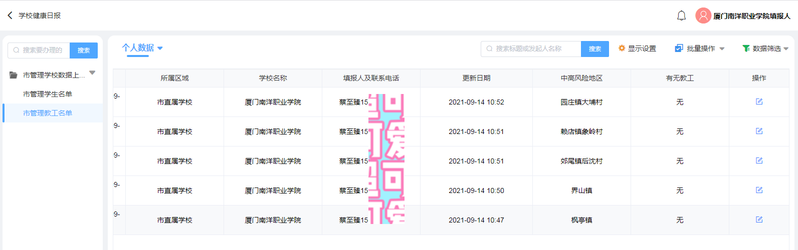 作为学校疫情防控信息员,行政科蔡至臻最主要的任务是每天要在规定的时间内上报学校的防控信息。这是防控疫情工作的重中之重,不仅要及时,更要准确无误。她深知这项工作的重要,更知道自己肩上的责任。
