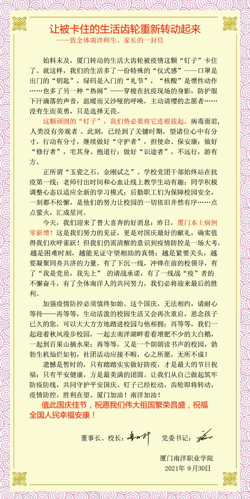 让被卡住的生活齿轮重新转动起来 ——致全体南洋师生、家长的一封信