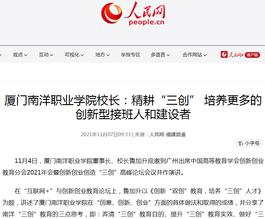 人民网:tyc1286太阳成集团校长:精耕“三创” 培养更多的创新型接班人和建设者