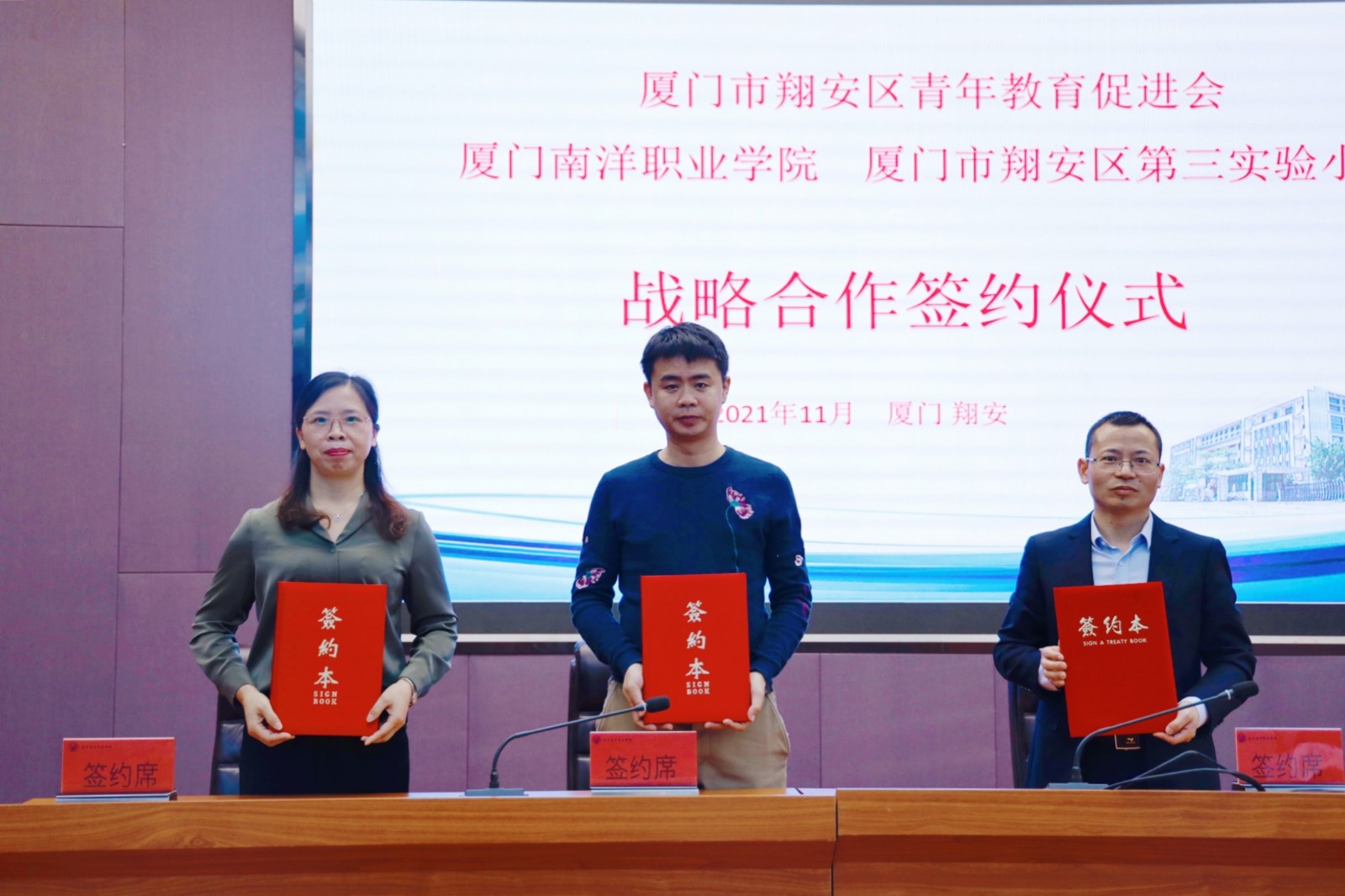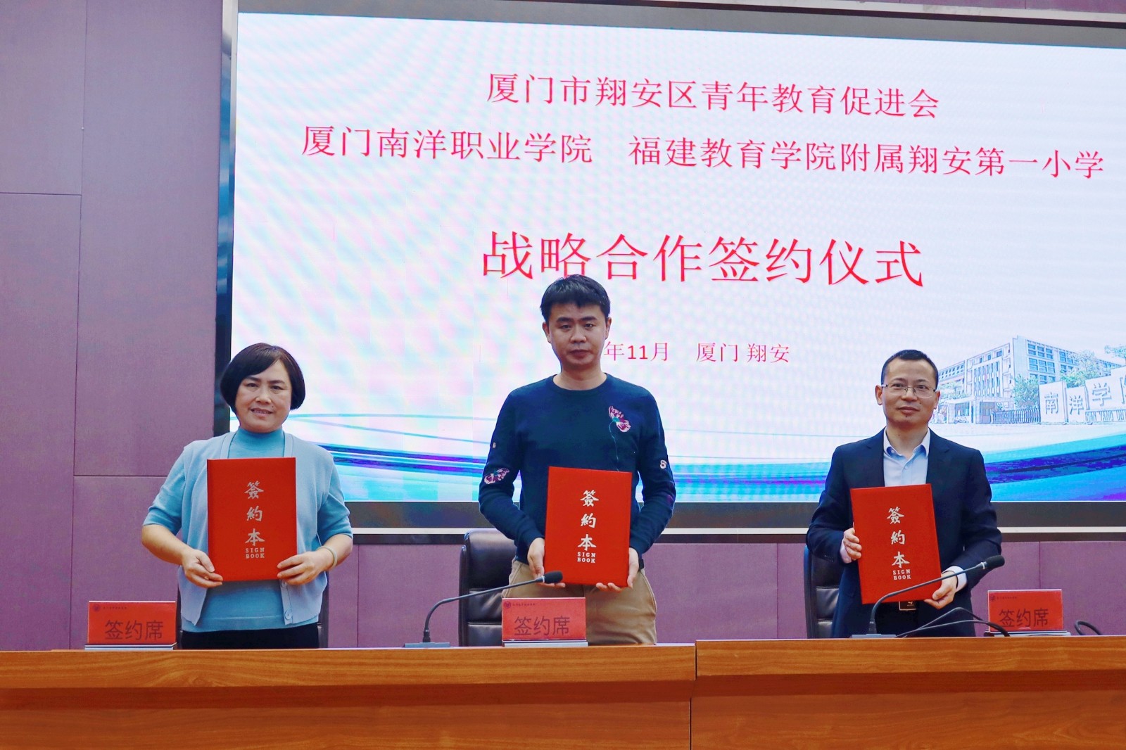 11月19日上午,翔安区青年教育促进会、福建教育学院附属翔安第一小学、厦门市翔安区第三实验小学、厦门南洋学院在我校仙岳报告厅就“公益社团进校园”项目举行了隆重的签约仪式。