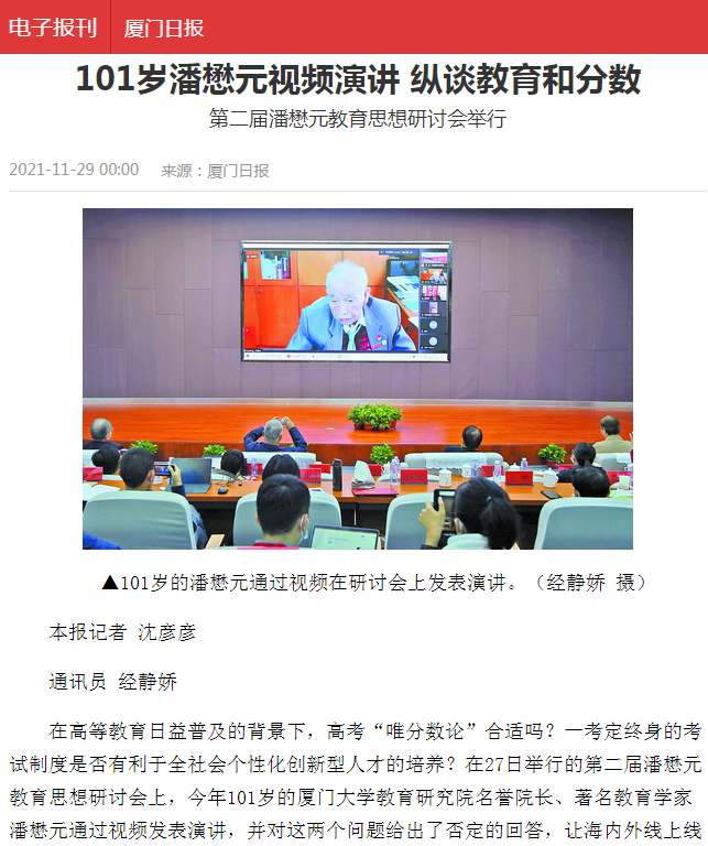 厦门日报:101岁潘懋元视频演讲 纵谈教育和分数