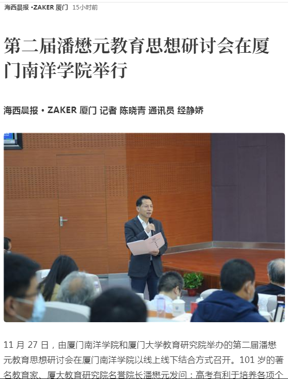 11 月 27 日,由厦门南洋学院和厦门大学教育研究院举办的第二届潘懋元教育思想研讨会在厦门南洋学院以线上线下结合方式召开。101 岁的著名教育家、厦大教育研究院名誉院长潘懋元发问:高考有利于培养各项个性化人才吗?潘懋元之问语惊四座,让线上线下 600 多位参会者陷入了沉思。