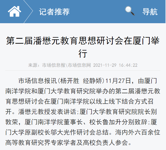 市场信息报讯(杨开胜 经静娇)11月27日,由厦门南洋学院和厦门大学教育研究院举办的第二届潘懋元教育思想研讨会在厦门南洋学院以线上线下结合方式召开。潘懋元教授发表讲话;厦门大学教育研究院院长别敦荣,厦门南洋学院董事长、校长鲁加升分别致辞;厦门大学原副校长邬大光作研讨会总结。海内外六百余位高等教育研究界专家学者及高校负责人参会。