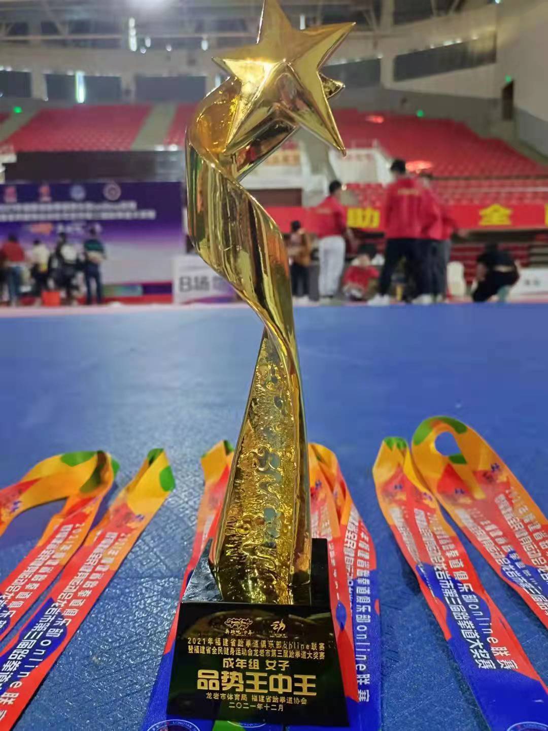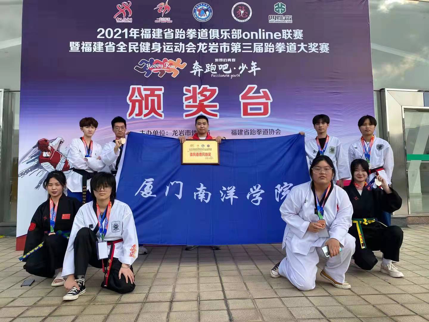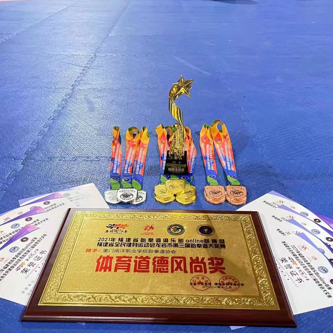 2021年12月31日至2022年1月3日,2021年福建省跆拳道俱乐部Online联赛暨福建省全民健身运动会龙岩市第三届跆拳道大奖赛在龙岩市如火如荼地举行,我校跆拳道协会斩获5金、4银、5铜以及体育道德风尚奖,其中徐稳弘同学获得女子成年组“品势王中王”奖项。