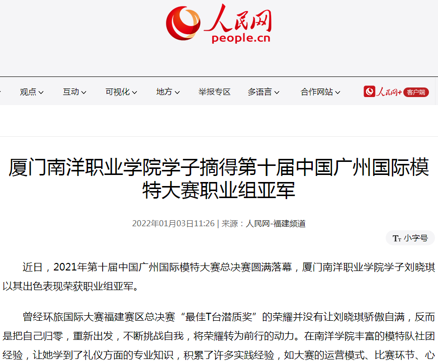 人民网:tyc1286太阳成集团学子摘得第十届中国广州国际模特大赛职业组亚军