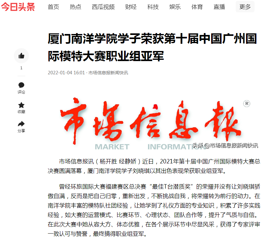 今日头条:厦门南洋学院学子荣获第十届中国广州国际模特大赛职业组亚军