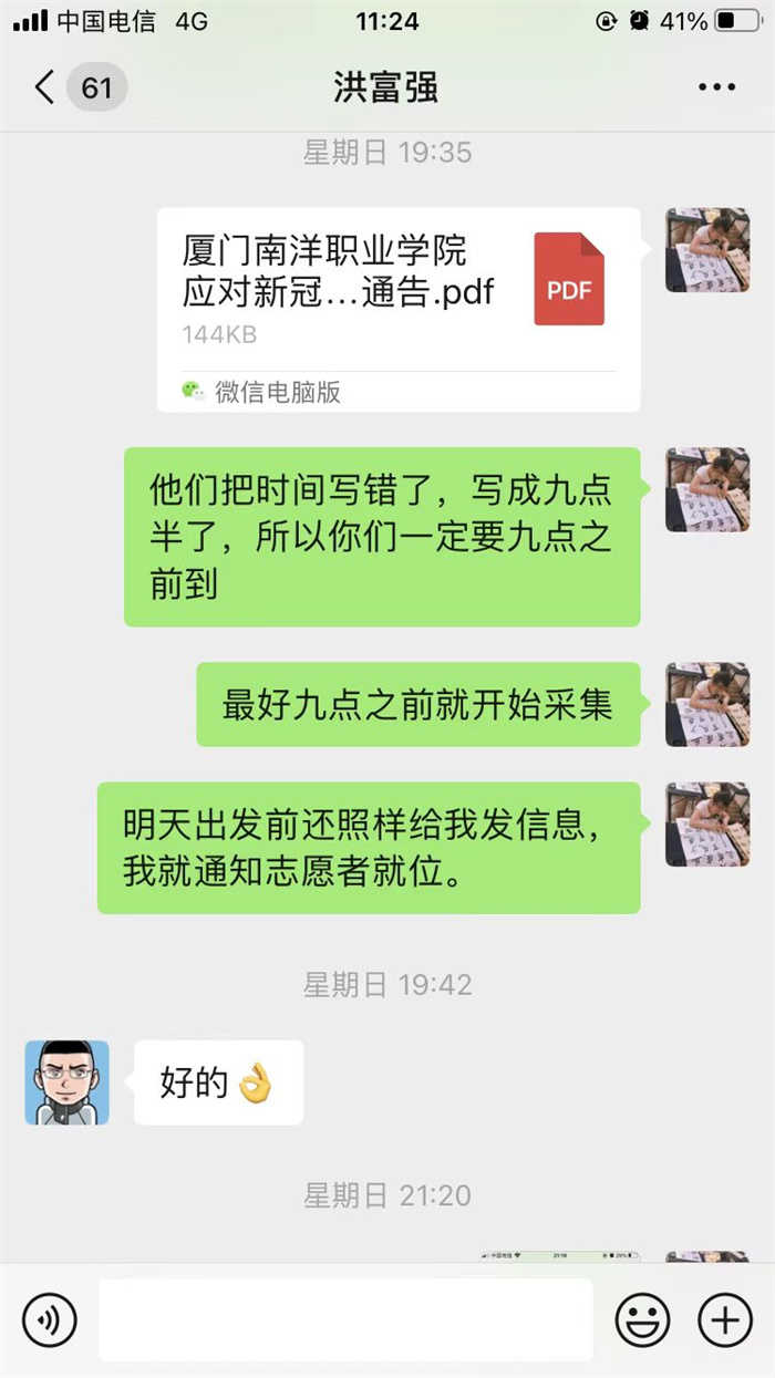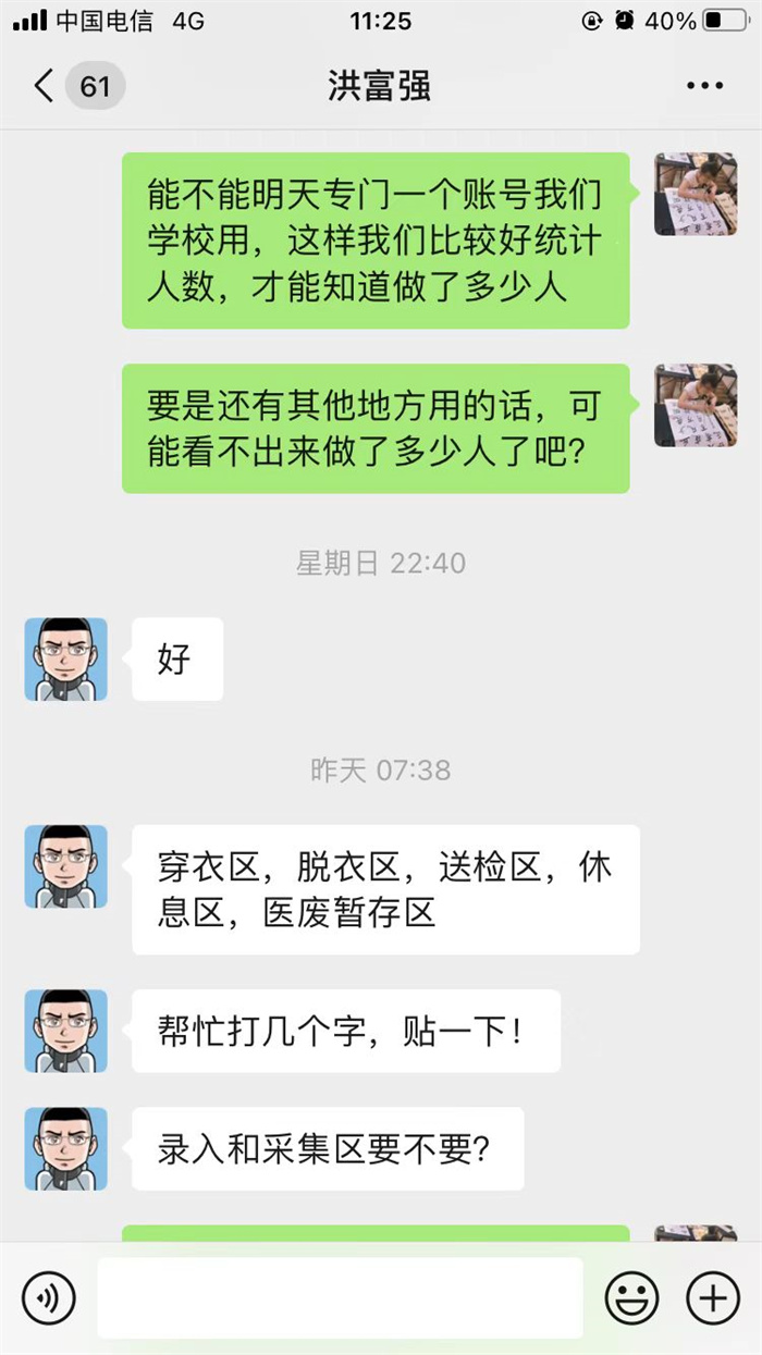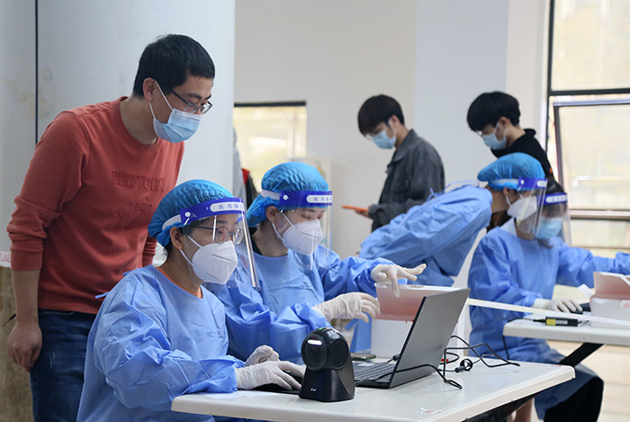来不及多想的康医生集多方力量多管齐下,经过一个多小时的沟通,终于联系上了一位刚结束海沧全员核酸检测工作的医护人员愿意来校进行检测。2:30,医护人员到位,康医生又担起了信息录入和采集工作,协助完成了泉州旅居史师生的核酸检测。