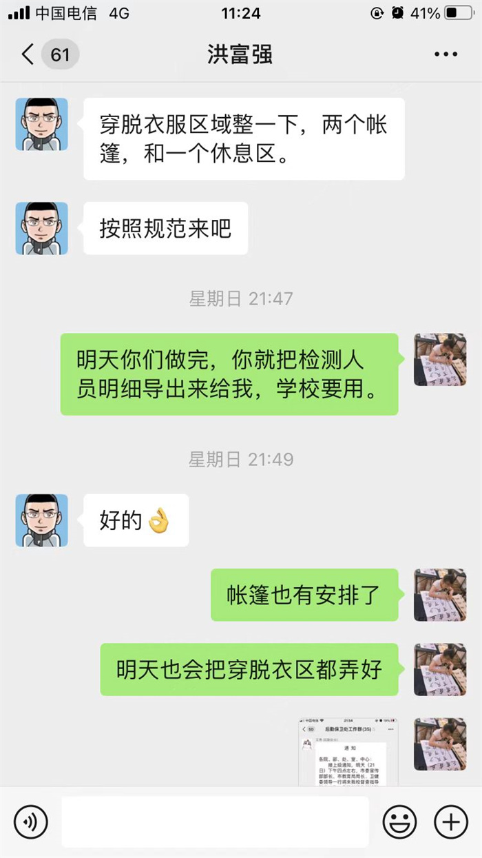 检测结束,天也亮了。来不及休息的康医生又拿起了手机,开始联系新一轮的全员核酸检测工作。皇天不负有心人,终于有了答复:下午2点前将有10组采样人员到校进行核酸检测。晚上9点多,全员核酸顺利完成,康医生半悬的心终于可以落下来了。