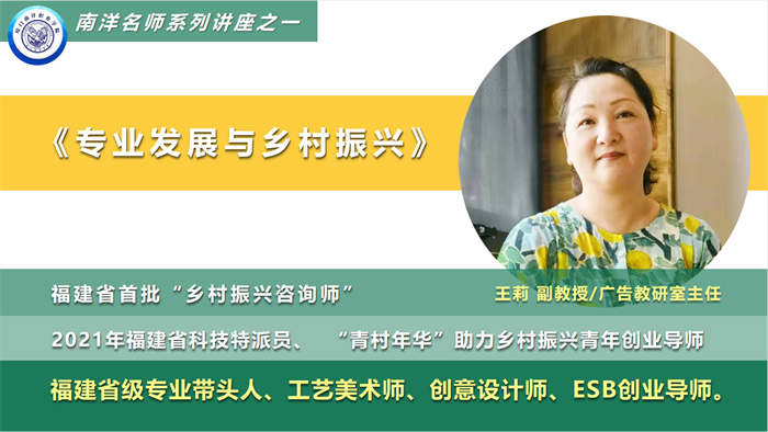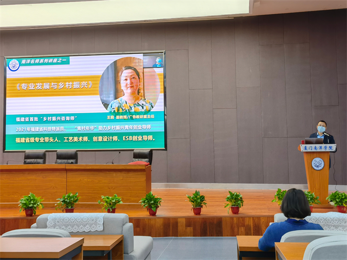 4月6日,南洋名师讲坛第一场以线上线下相结合的方式开讲。艺术设计学院广告教研室主任王莉作“专业发展与乡村振兴”专题讲座。副校长钟石根主持。