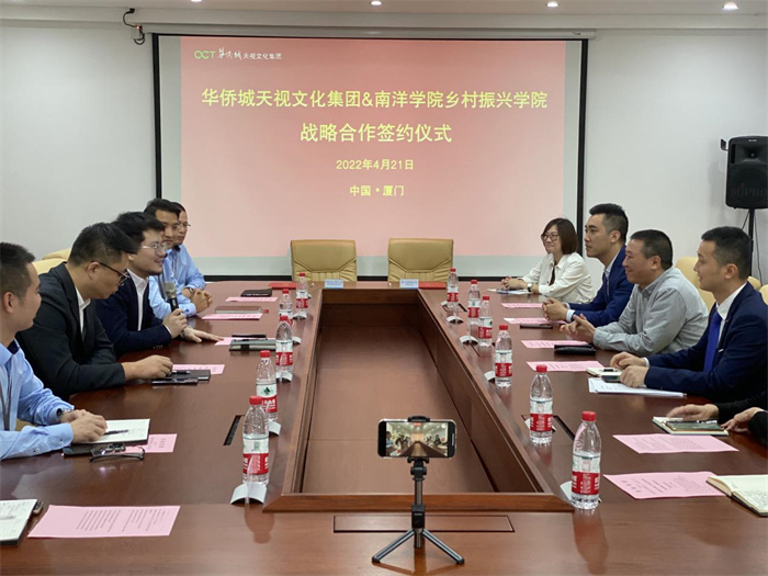 昨日,我校在华侨城天视文化集团(厦门)与其签订战略合作协议。学校乡村振兴学院执行院长林志民、电影学院执行院长曾艳,华城天视董事总经理李胜杰、厦门田园牧歌文旅有限公司总裁蔡朝铭等出席会议。