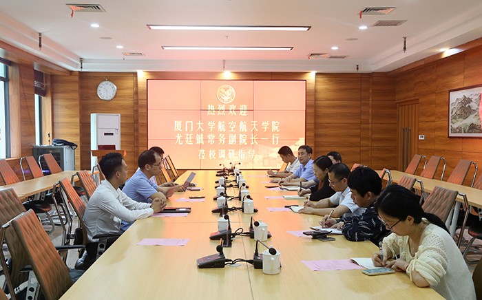 5月25日上午,厦门大学航空航天学院常务副院长尤延铖、动力工程系主任黄玥、飞行器系副教授吴了泥、飞行器系工程师杨江波一行来我校参观调研。我校校领导鲁晓芹、钟石根、许智坚,教务处处长李建清,信息工程学院/航空机电学院执行院长侯红科及相关负责人陪同调研。