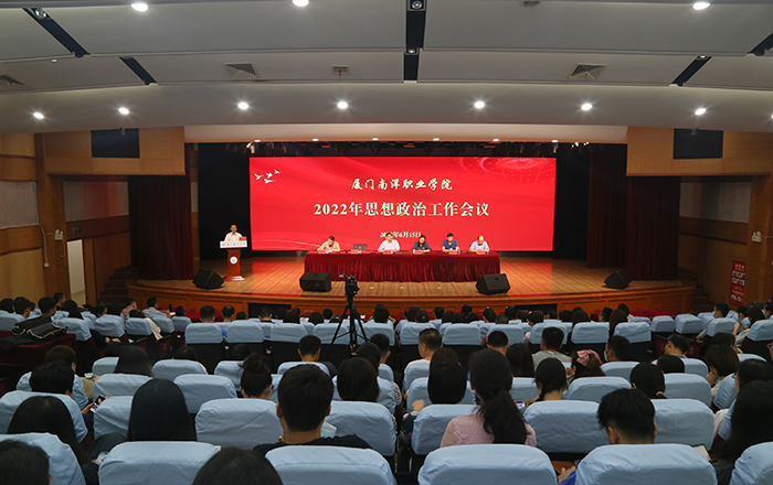 为进一步学习贯彻党的十九届六中全会精神及习近平总书记关于精神文明建设的重要论述,深入落实厦门市创建全国文明典范城市工作动员部署会要求,全面深化教学改革,加强内涵建设,提高人才培养质量,提升立德树人水平,加强学校 “文明创建”力度,深入推进建设“负责任的职业大学”,全面推动学校党建和思想政治工作高质量发展,6月15日下午,我校在活动中心礼堂召开了2022年思想政治工作会议。校领导施水成、鲁晓芹、钟石根、许智坚、李振杰、蓝德森出席会议,全体教职员工、学生代表参加会议。执行校长钟石根主持会议。