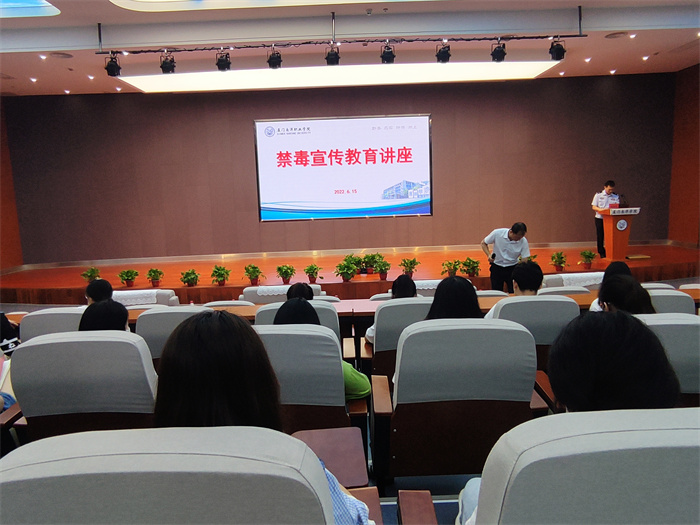 进一步助力学校文明创建工作,营造了安全稳定的校园环境,深化学校毒品预防教育工作,6月15日,我校结合“全民禁毒宣传月”及毕业季, 特邀厦门司法强制隔离戒毒所四大队副大队长、厦门市红罂禁毒宣讲团成员刘晓华警官为同学们带来禁毒知识讲座。保卫科同志及学生代表近200名现场聆听讲座。