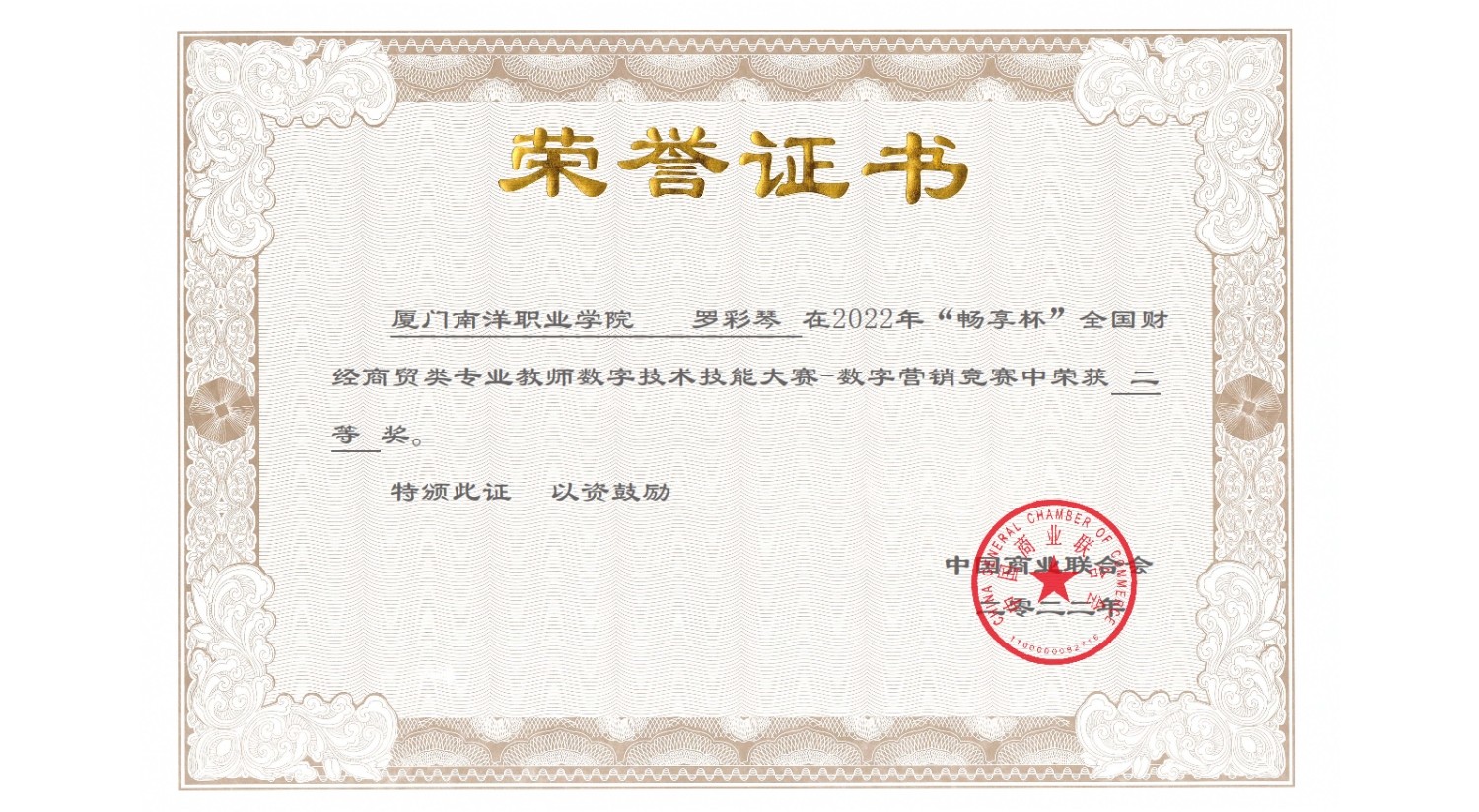 近日,由中国商业联合会主办、中教畅享(北京)科技有限公司承办的2022年“畅享杯”全国财经商贸类专业教师数字技术技能大赛落下帷幕,经过多日比拼,我校经济管理学院/三创学院罗彩琴老师斩获二等奖。