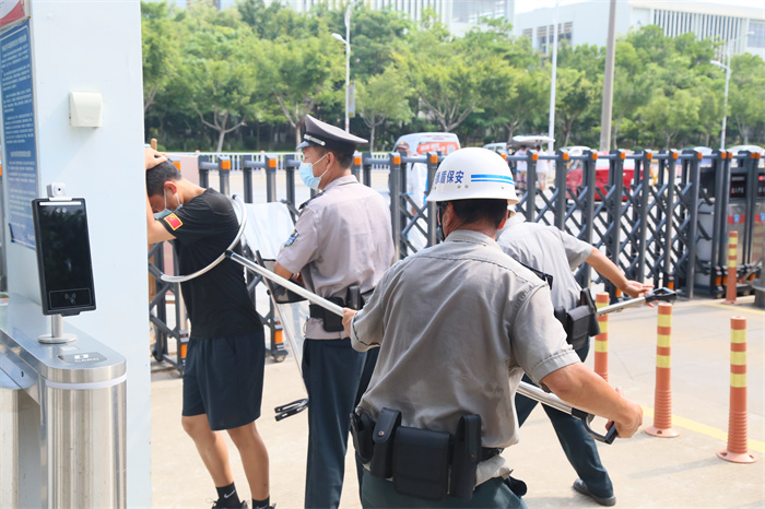 一来访人员拒绝配合值班保安的疫情防控检查硬闯学校,保安人员立即关闭铁门,通知其他保安同志赶往现场协助处置,并迅速启动学校反恐防暴应急处置程序。多名保安同志使用防暴器械协同控制闯岗人员后,迅速将该外来人员带到校门口临时观察区。之后采取情景一的应对措施。学校进入全面应急状态,立即实施应急救援行动。