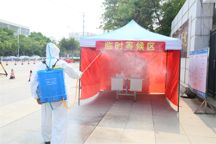 现场消毒组立即对校门口临时观察区、疑似涉疫学生活动区域进行应急消毒处理。