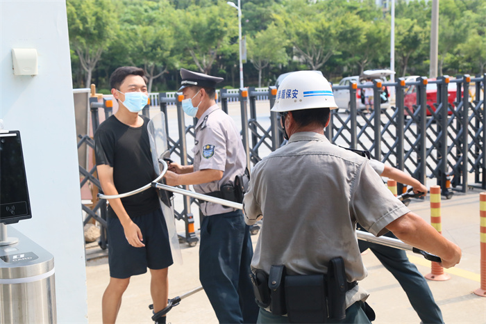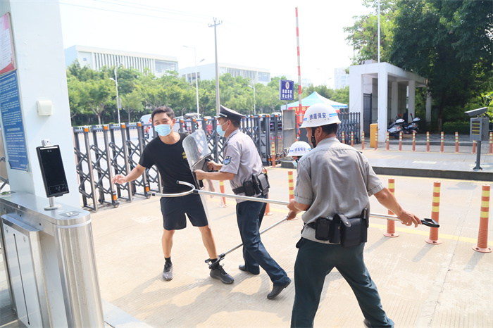 演练分为校门口师生体温检测异常、外来人员拒绝出示健康码闯岗等两个场景。