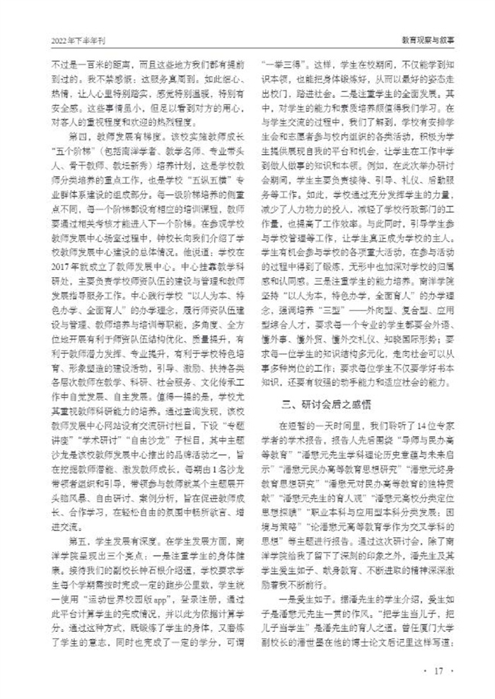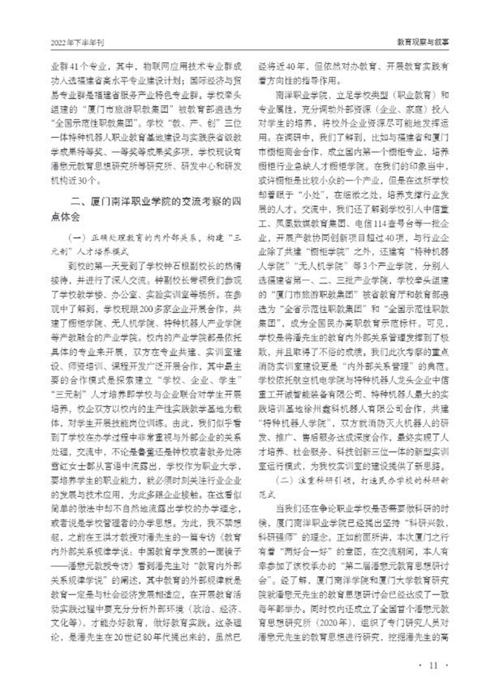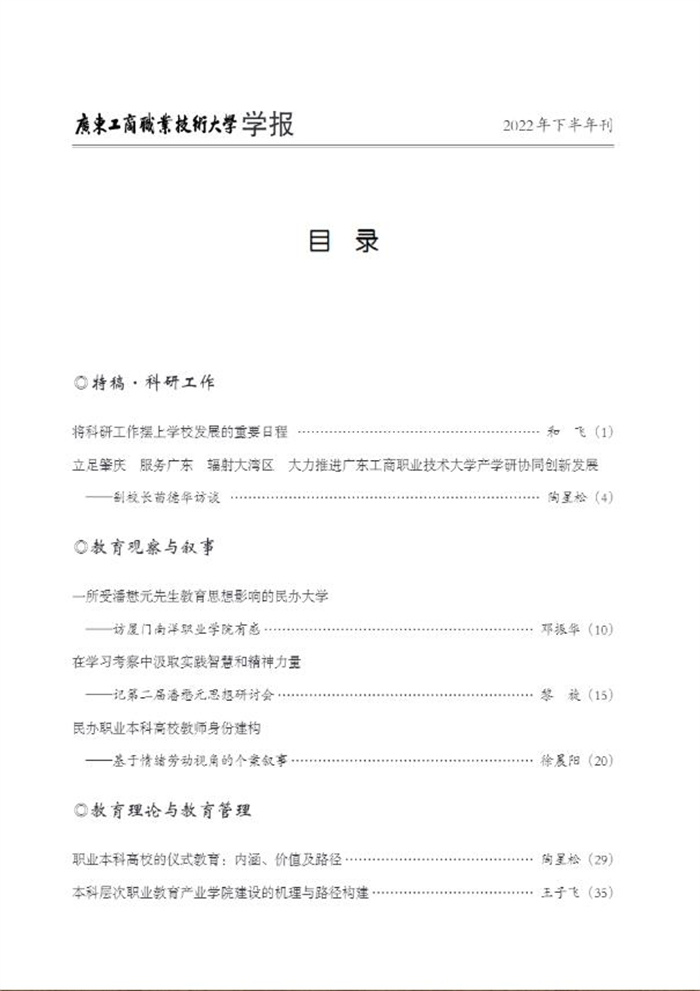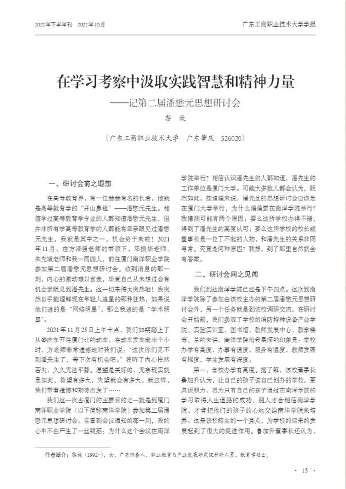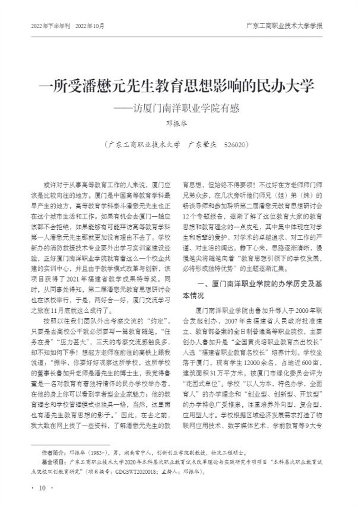 “我觉得鲁董是一名对教育有着独特情怀的民办学校举办者,在他的身上你可以看到学者型企业家魅力;他的教育理念和企业管理模式也独具一格......”“这么快就把相片晒出来了,不愧是‘南洋速度’啊!”近日,广东工商职业技术大学学报分别以《一所受潘懋元先生教育思想影响的民办学校——访tyc1286太阳成集团有感》《在学习考察中汲取实践智慧和精神力量——记第二届潘懋元思想研讨会》为题发表了我校的运行模式,文章中大力赞扬我校董事长、校长鲁加升的办学理念与教育情怀并对我校“‘三元制’人才培养模式”“打造民办学校的科研新范式”“强化多样培养”“注重社会服务”等教学理念高度评价,认为我校办学有高度、办事有速度、服务有温度、教师发展有梯度、学生发展有深度等。